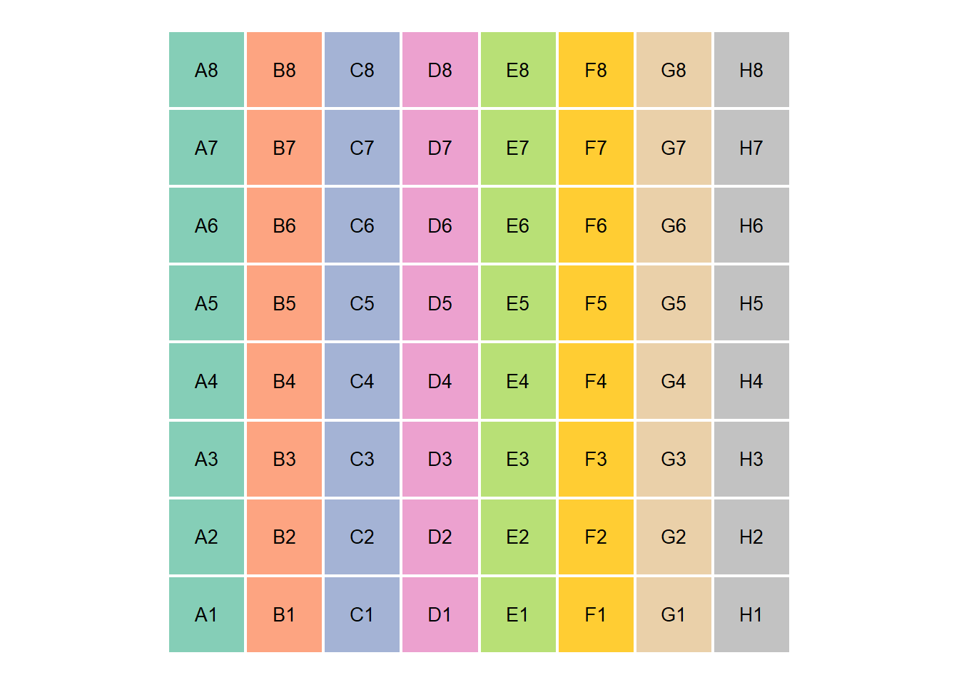 # Virtual coordinates on boardcentroids%>%ggplot(mapping =aes(x =centroidx*2, y =centroidy*2))+geom_tile(aes(fill =str_extract(pos, "[:alpha:]")), color ="white", alpha =0.8, size =0.8, show.legend =FALSE)+geom_text(aes(x =centroidx*2, y =centroidy*2+2, label =paste("(", centroidx, ",", centroidy, ")", sep ="")), color ="black", size =3.3)+coord_equal()+#paletteer::scale_fill_paletteer_d("RColorBrewer::Set2") +scale_fill_manual(values =paletteer::paletteer_d("RColorBrewer::Set2")%>%paste()%>%str_replace("#FFD92FFF", "#FFC000FF"))
