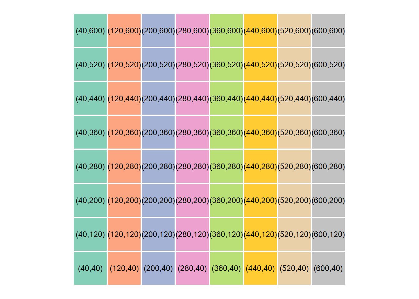 # Real world coordinates on boardcentroids%>%ggplot(mapping =aes(x =centroidx*2, y =centroidy*2))+geom_tile(aes(fill =str_extract(pos, "[:alpha:]")), color ="white", alpha =0.8, size =0.8, show.legend =FALSE)+geom_text(aes(x =centroidx*2, y =centroidy*2+2, label =paste("(", x_mapped, ",", y_mapped, ")", sep ="")), color ="black", size =3.3)+coord_equal()+#paletteer::scale_fill_paletteer_d("RColorBrewer::Set2") +scale_fill_manual(values =paletteer::paletteer_d("RColorBrewer::Set2")%>%paste()%>%str_replace("#FFD92FFF", "#FFC000FF"))